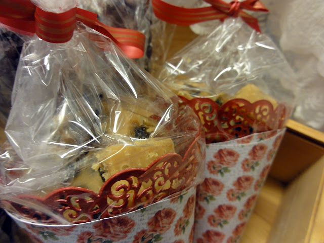 Strutarna fudgen ligger i har jag tillverkat själv (med lite hjälp av Stina) och är en komposition bestående av 4 delar. Ett tjockt fint papper som blir struten, smörpapper innuti för att skydda strutpappret, cellofan som hålls fast av en "cupcakewrap" som är hjärtspetsen på struten. Mäta (höfta), klippa, klistra. Sjukt jävla pyssligt.
